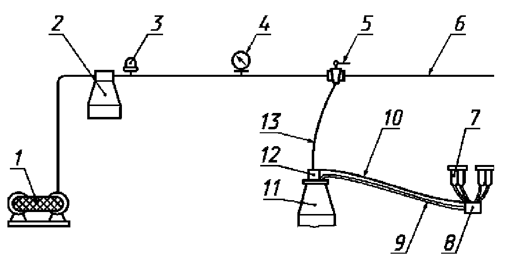 1 - вакуумный насос; 2- вакуумный сосуд; 3 - регулятор; 4 - вакуумметр; 5 - вакуумный кран; 6 - воздушный трубопровод; 7 - стаканы для сосков; 8 - держатель; 9 - длинная трубка для молока; 10 - длинная пульсирующая трубка; 11 - бидон; 12 - вибратор; 13 - вакуумная трубка
