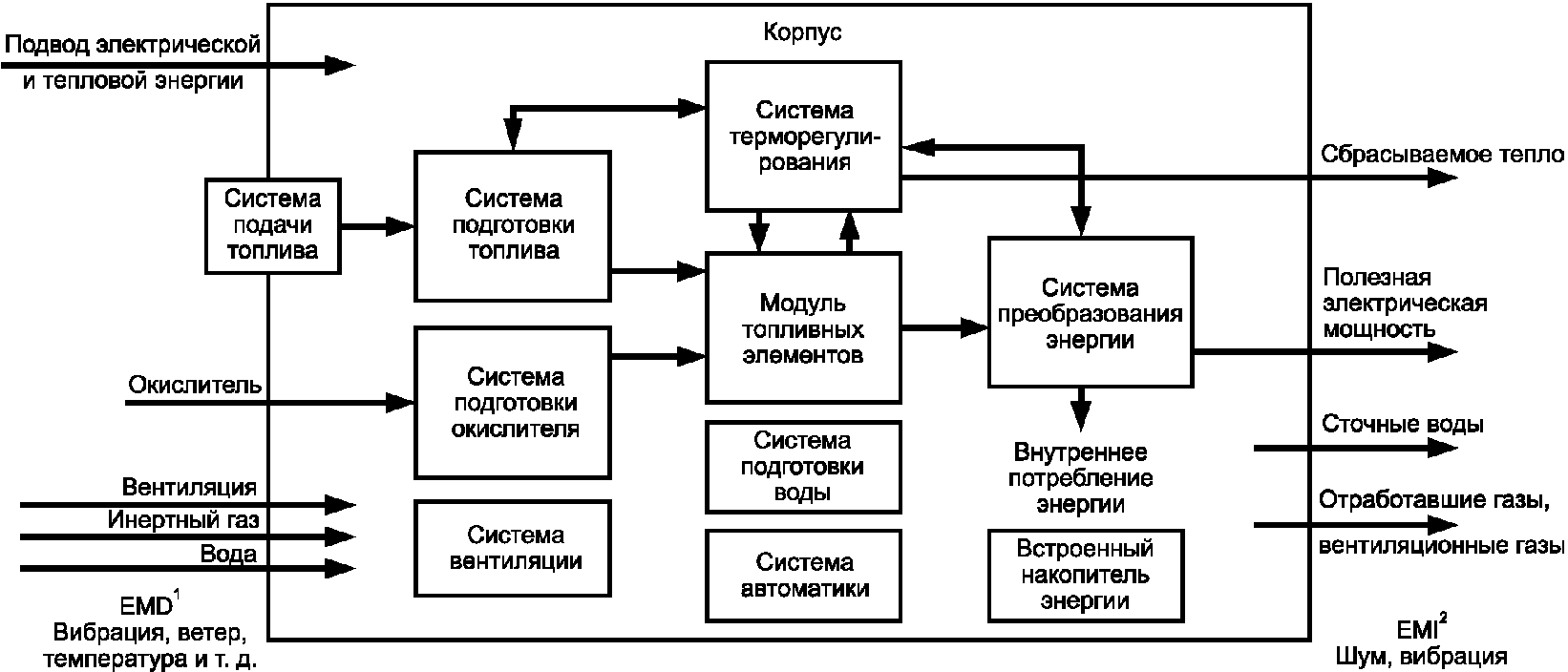 - система подготовки топлива (fuel processing system), представляющая собой химико-технологическое оборудование, в том числе теплообменники и устройства управления, необходимое для преобразования подаваемого топлива в смесь, подходящую для батареи топливных элементов;