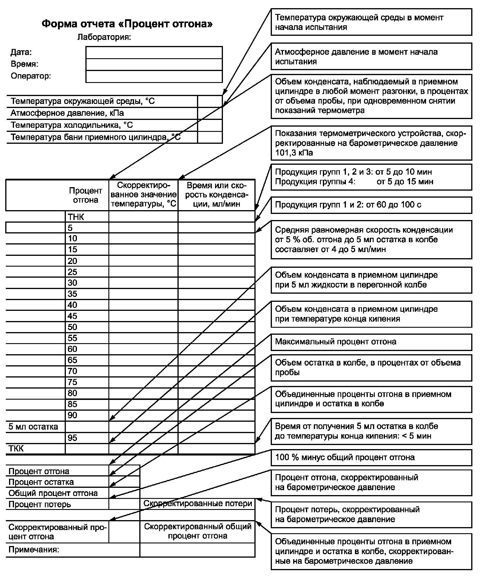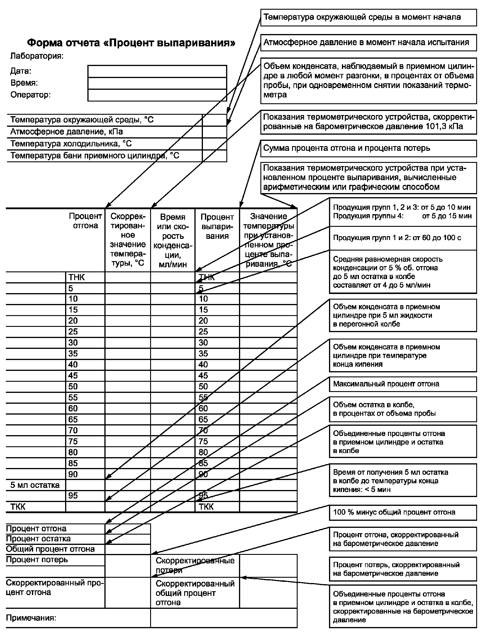 Примечание 2. Процент остатка после перегонки выражают в процентах к объему образца.