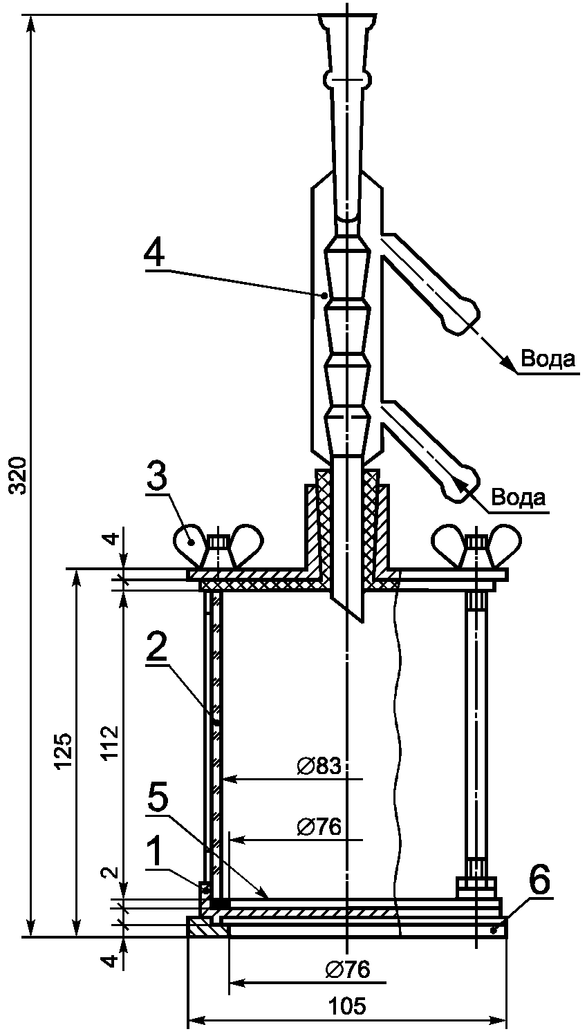 1 - испытуемый образец; 2 - кварцевый патрубок; 3 - гайка-барашек М6 по ГОСТ 3032; 4 - холодильник типа ХШ4 по