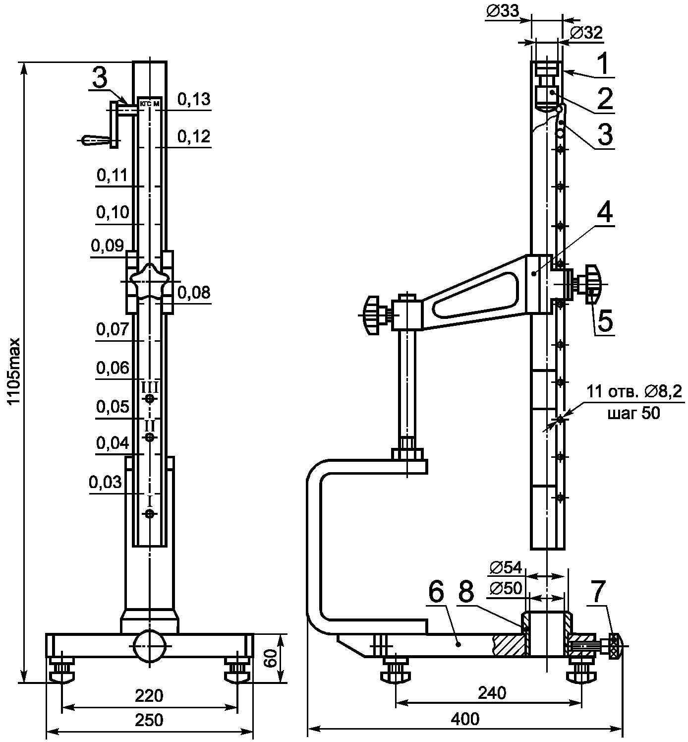 1 - направляющая труба; 2 - ударник; 3 - фиксатор; 4- кронштейн; 5 - стопор трубы; 6 - основание; 7 - стопор кольца; 8 - кольцо (комплект)