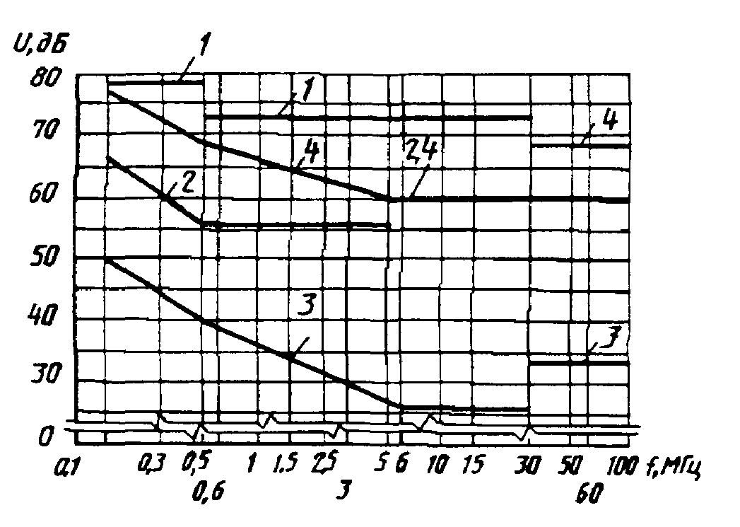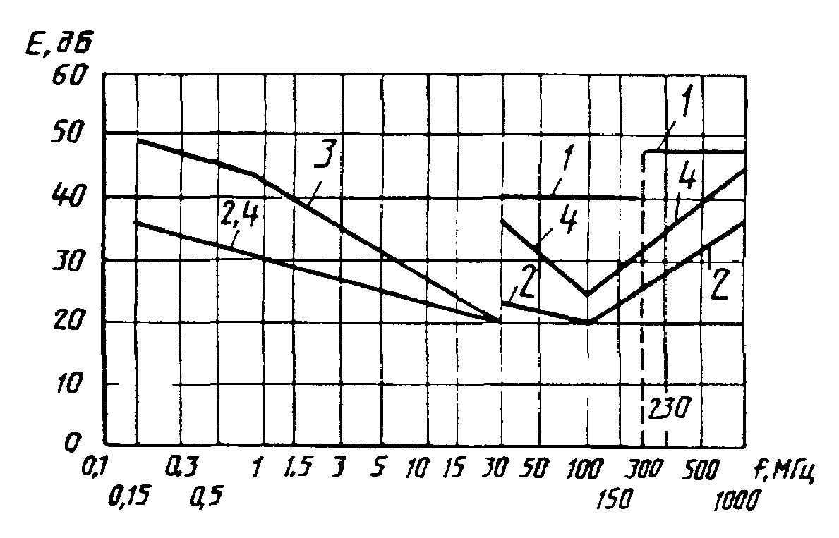 Примечание. До 01.01.95 квазипиковое значение напряженности поля радиопомех в полосе частот 0,15 - 30 МГц не должно превышать значений, указанных на графике 3