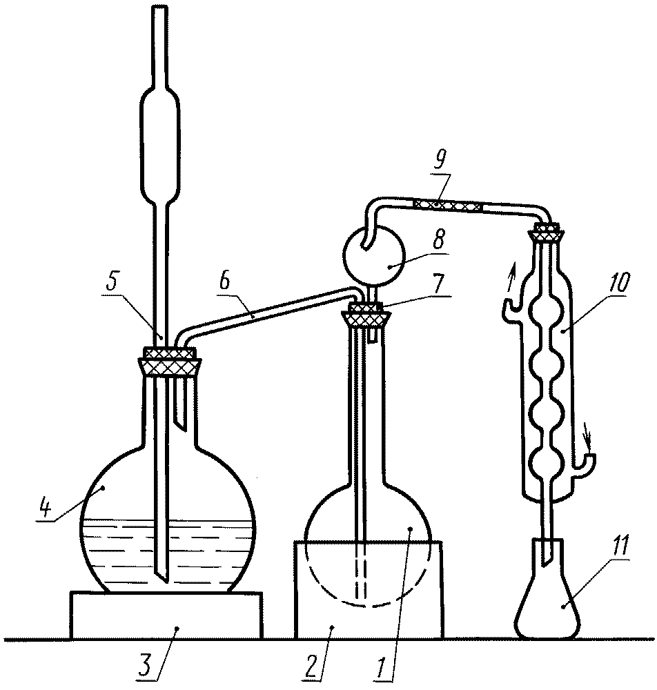 Анализ проводят с использованием прибора для перегонки водяным паром. Навеску фарша, приготовленного по
