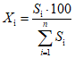 Массовую долю каждого компонента (Xi) в процентах вычисляют по формуле