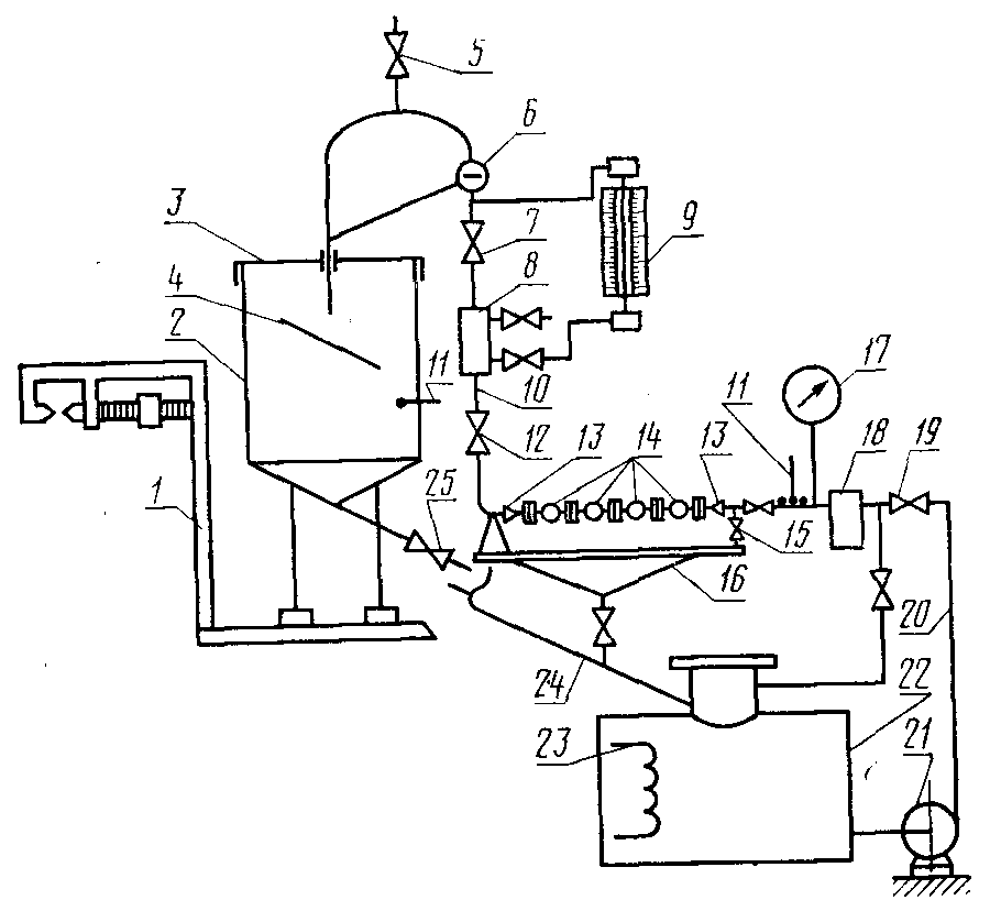 15, 25 - сливной кран; 16 - стол-стенд; 17 - манометр;