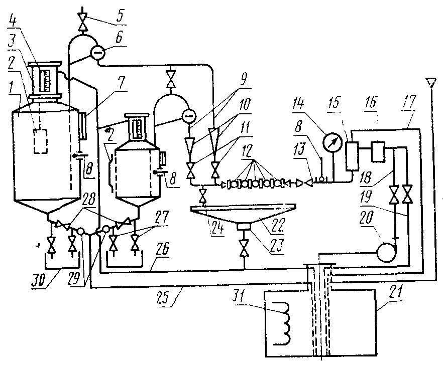 19 - разгрузочный трубопровод; 20 - насос; 21 - резервуар;
