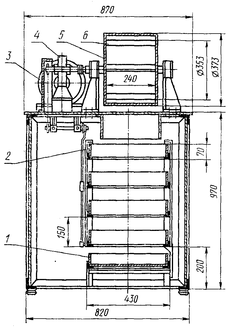 1 - противень; 2 - сито; 3 - электромотор; 4 - редуктор;