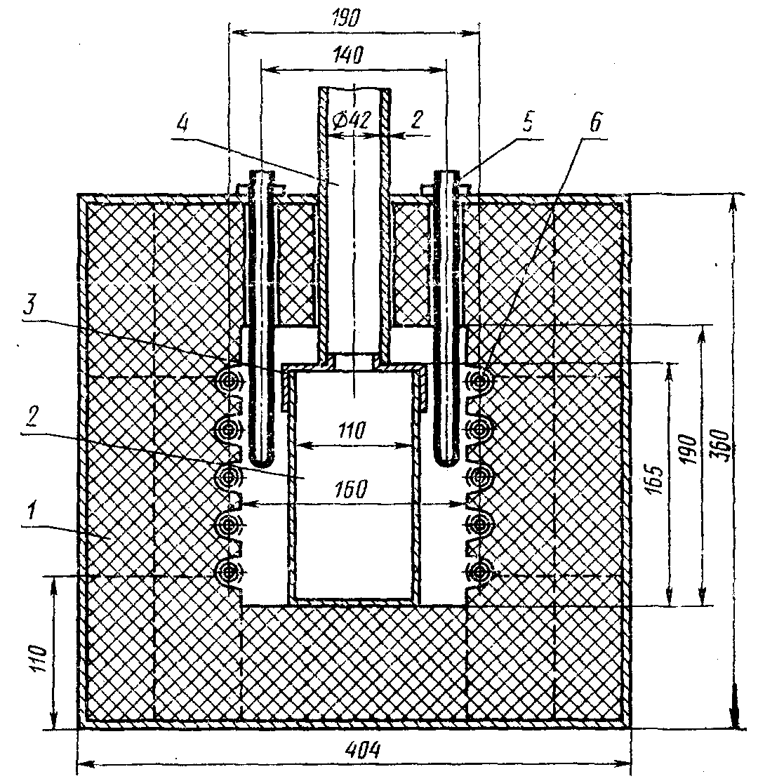 4.1.1. Отключают автотрансформаторы, быстро открывают дверцу камеры и вставляют ящик на равном расстоянии от боковых стенок камеры и вплотную к стенке, противоположной дверце, так, чтобы отверстие в крышке ящика и верхней части печи, а также в дверце камеры и передней стенке ящика совпадали. Дверцу камеры закрывают и через отверстие в верхней части камеры на крышку ящика ставят трубу для отвода летучих продуктов коксования.