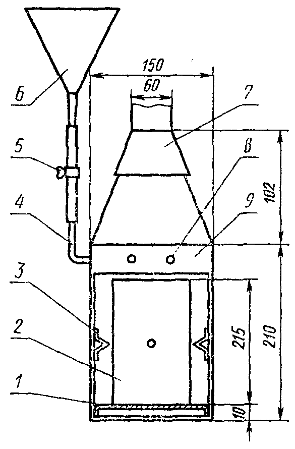 Из бункера после открытия шибера весь уголь поступает в ящик для коксования. Высота падения угля (расстояние от шибера бункера до дна ящика) должна быть 200 мм. Для равномерной загрузки угля шибер располагают над центром ящика. Отверстие для термопары в передней части ящика прикрывают бумагой. При загрузке углем ящик устанавливают на лист бумаги или противень. Просыпавшийся уголь тщательно собирают и переносят в ящик.