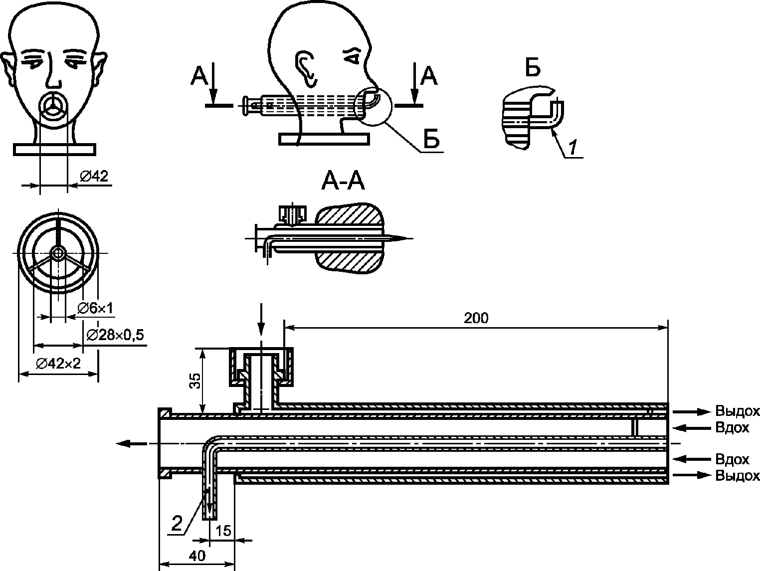 2.1 четвертьмаска: Лицевая часть, закрывающая нос и рот и обеспечивающая подачу очищенного воздуха или дыхательной смеси к органам дыхания.