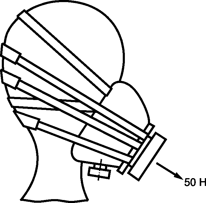 3.6.3 Все головные ремни должны выдерживать растяжение 50 Н, приложенное в направлении растяжения в течение 10 с. Такое же требование предъявляется к пряжкам и присоединительным зажимам.