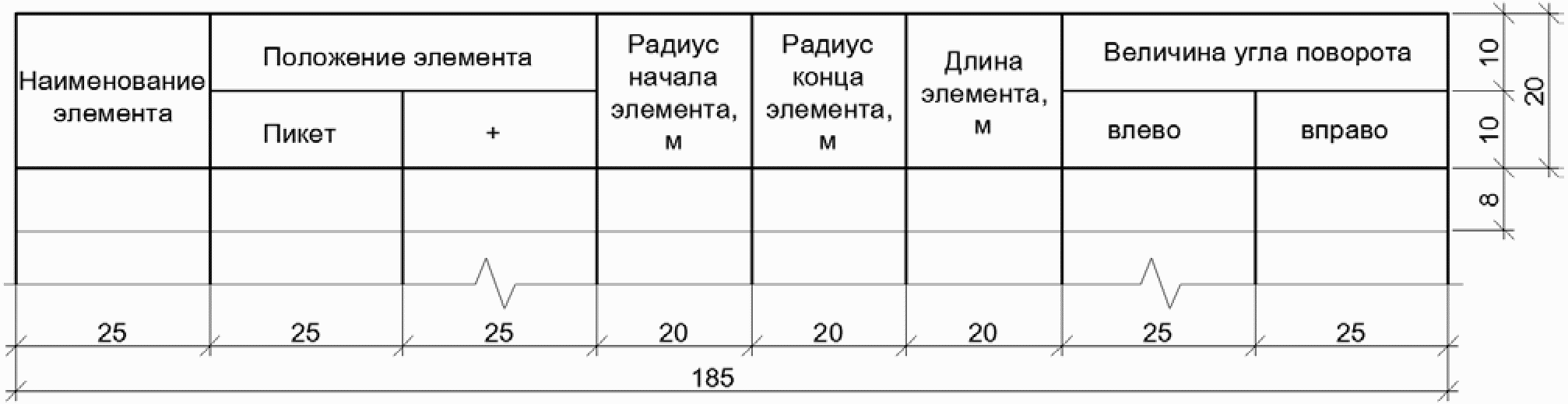 Наименование элемента | Положение элемента | Радиус начала | Радиус конца | Длина элемента, | Величина угла поворота |
