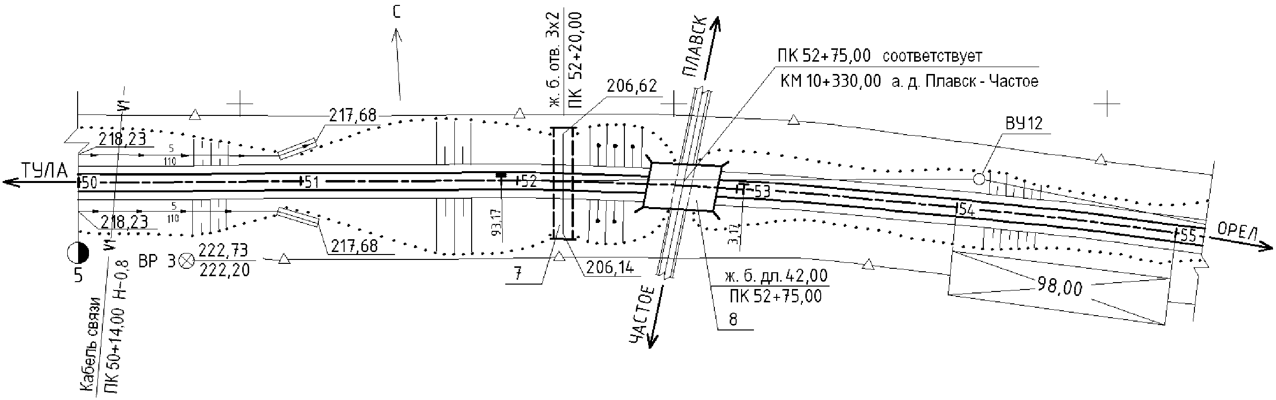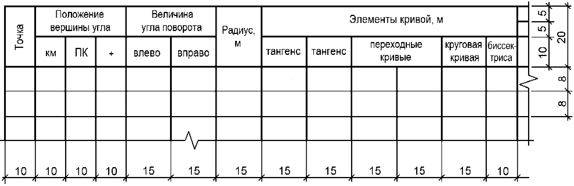 КМ | ПК | + | влево | вправо | тангенс | тангенс | переходные кривые | круговая кривая | биссектриса | начало | конец | начало | конец |