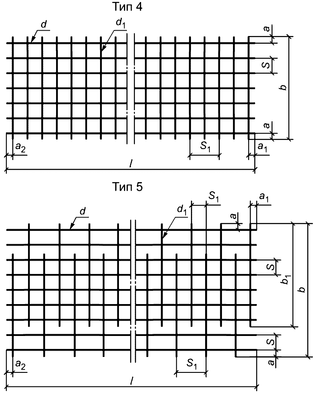 Вид сетки | Тип сетки | Ширина сетки b | Длина сетки l | Диаметры стержней  | Расстояние между стержнями (в осях) - шаг стержней | Размеры выпусков стержней |