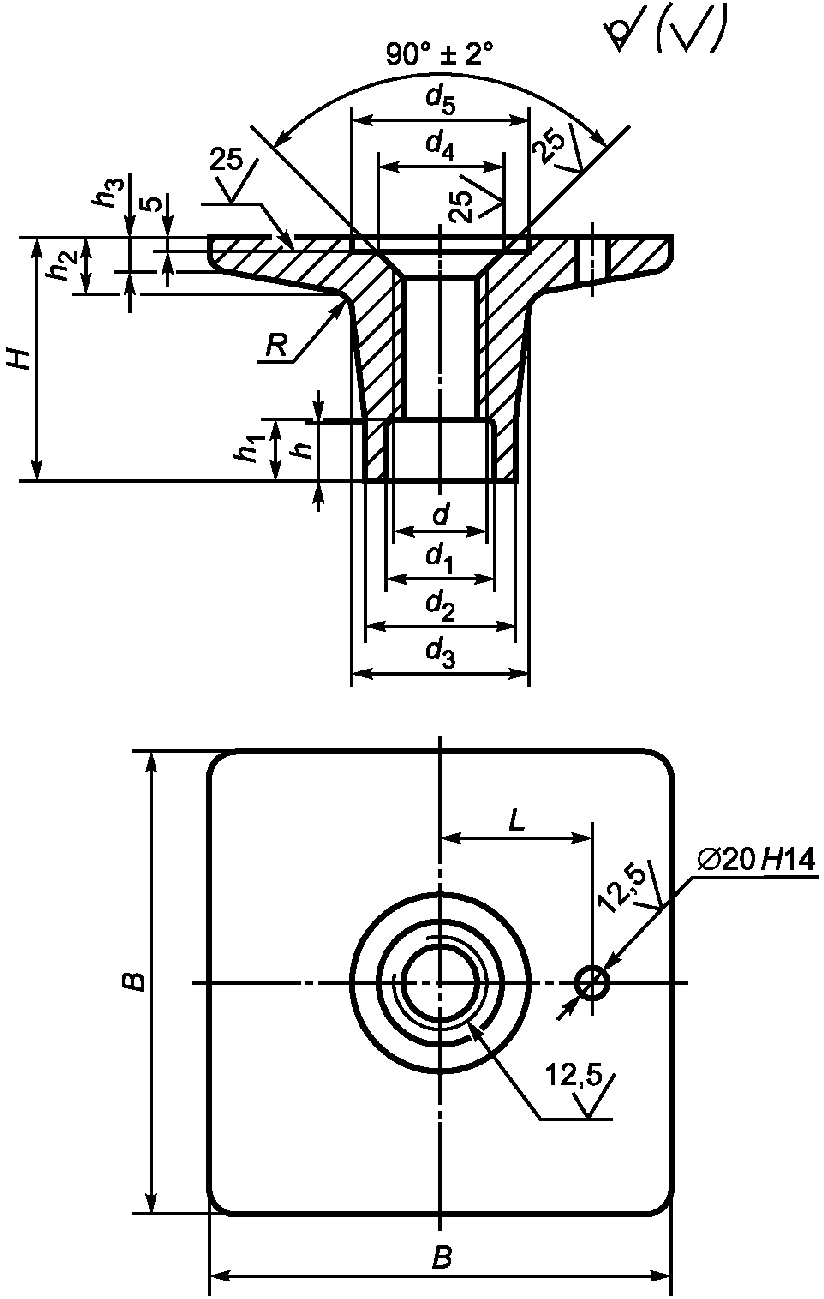 Номинальный диаметр резьбы d | Шаг резьбы | d1 | d2 | d3 | d4 | d5 | B | l | H | h | h1 | h2 | h3 | R | Теоретическая масса плиты, кг | |