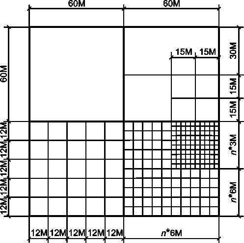 3.9. Модульная сетка: совокупность линий на одной из плоскостей модульной пространственной координационной системы. Основная модульная сетка - это сетка, расстояние между параллельными линиями которой равно укрупненным модулям (мультимодулям).