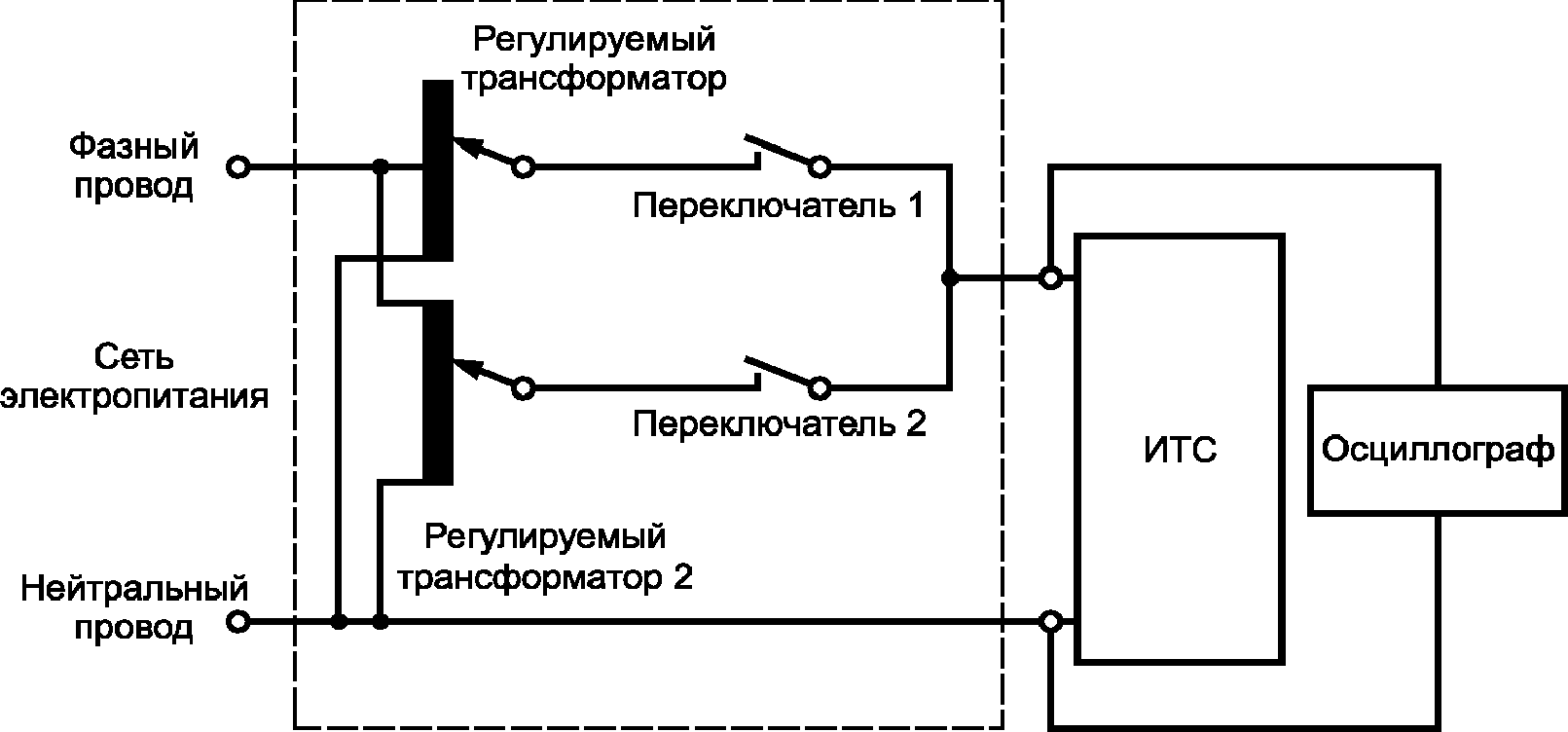 C.1 b. Для того чтобы проверить функционирование ИТС в определенных условиях, прерывания и изменения напряжения создаются с использованием двух трансформаторов с регулируемым выходным напряжением.