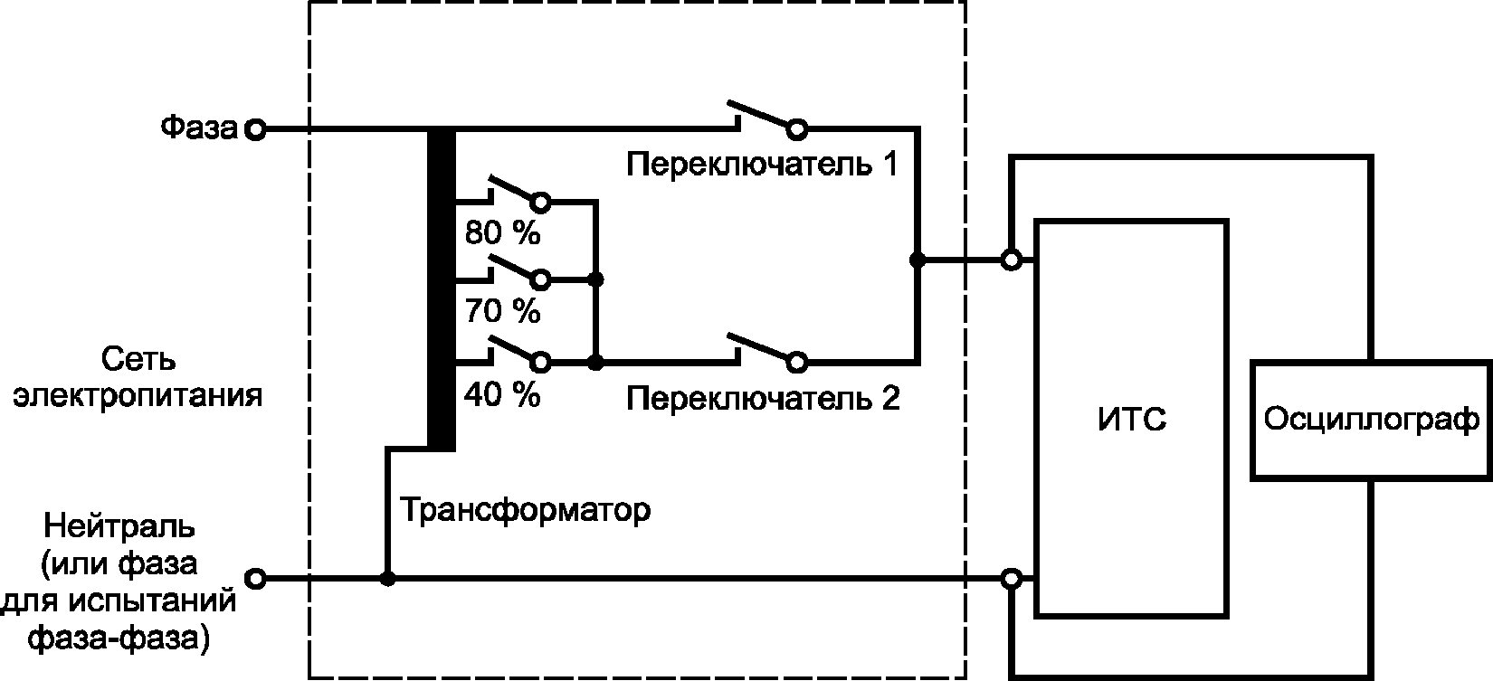 Провалы и прерывания напряжения имитируют попеременной коммутацией переключателей 1 и 2. Эти переключатели никогда не замыкаются в одно и то же время; при этом допускается нахождение двух переключателей в открытом состоянии не более 100 мкс. Должна быть предусмотрена возможность включать и отключать переключатели при разных значениях фазового угла. Современные полупроводниковые приборы соответствуют этим требованиям, тогда как тиристоры и триаксы, используемые ранее, могут открываться только во время перехода напряжения через нуль.