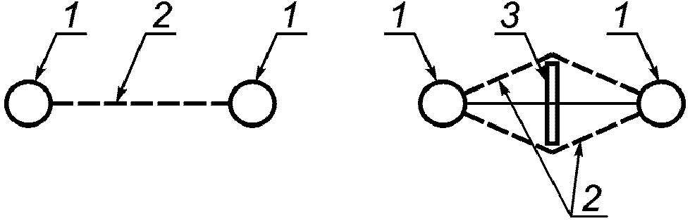 В.4.1.2. Зазор рассматривают как самое короткое расстояние по воздуху между двумя проводящими частями. Если между проводящими частями имеется изолирующая деталь, например перегородка, расстояние измеряют вдоль пунктирных линий, как показано на рисунке В.4.