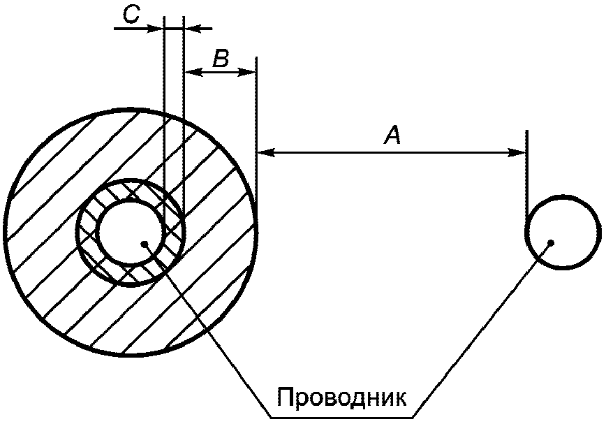 Допустим, что на рисунке В.5 A - это зазор, B - это расстояние разделения через заливочный компаунд, а C - расстояние разделения через твердую изоляцию.