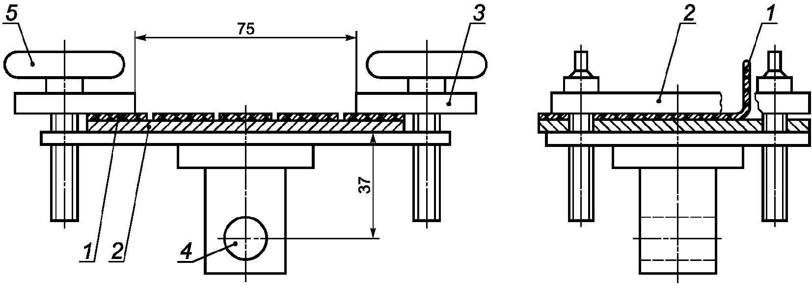 рисунком А.2 (Приложение А) или другую струбцину, обеспечивающую данные условия испытаний) для крепления образцов в захватах машины, при этом приспособление крепится к неподвижному захвату машины, а образец отслаиваемого покрытия - к подвижному зажиму;