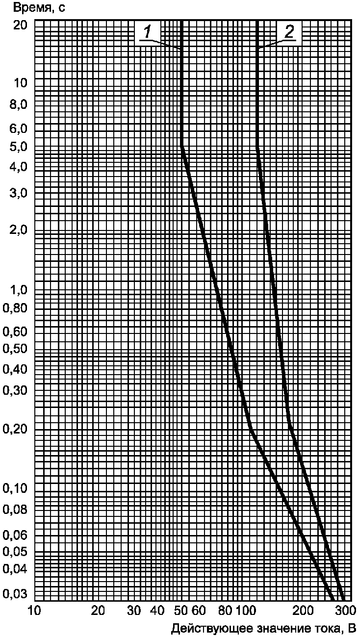 Примечания 1. Графа 3 таблицы относится к сглаженному постоянному току, например, от аккумуляторов. Если источником питания является выпрямленный переменный ток, используют значения графы 2. Соответствующие значения для выпрямленного переменного тока разрабатываются. 2. Форма волны предполагаемого напряжения прикосновения постоянного тока может изменяться в зависимости от типа питания и параметров поврежденной цепи. |