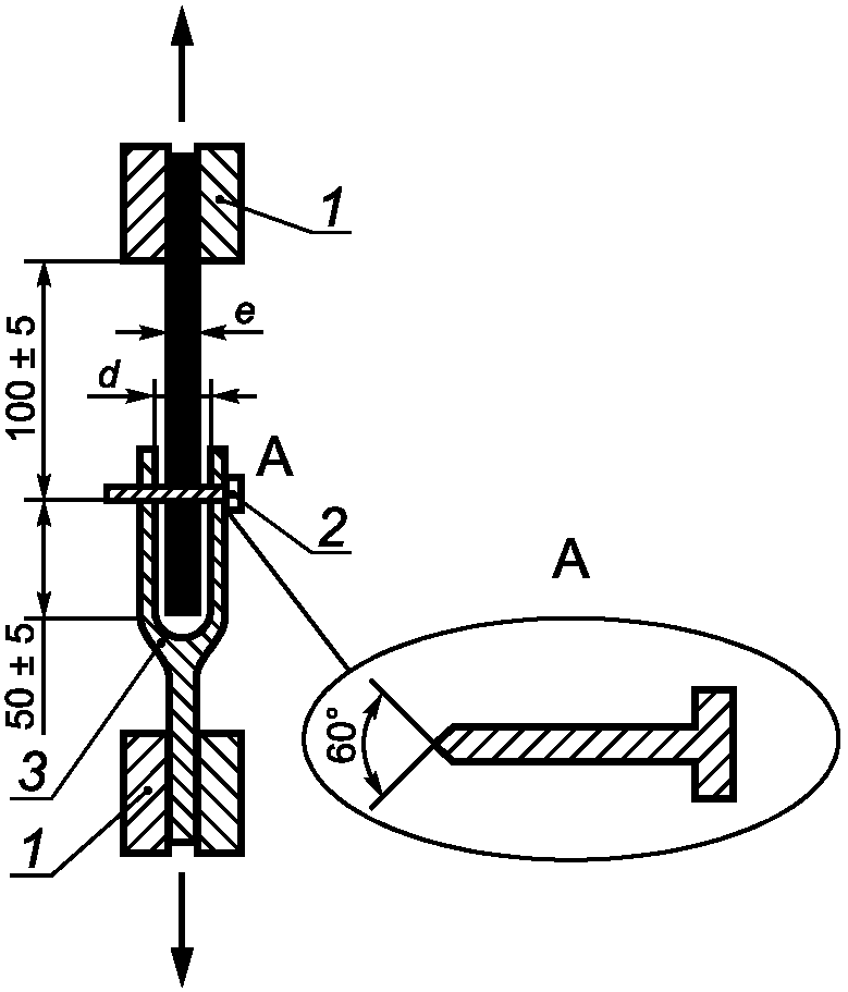 (e + 1 <= d <= e + 2); 1 - зажимы разрывной машины;
