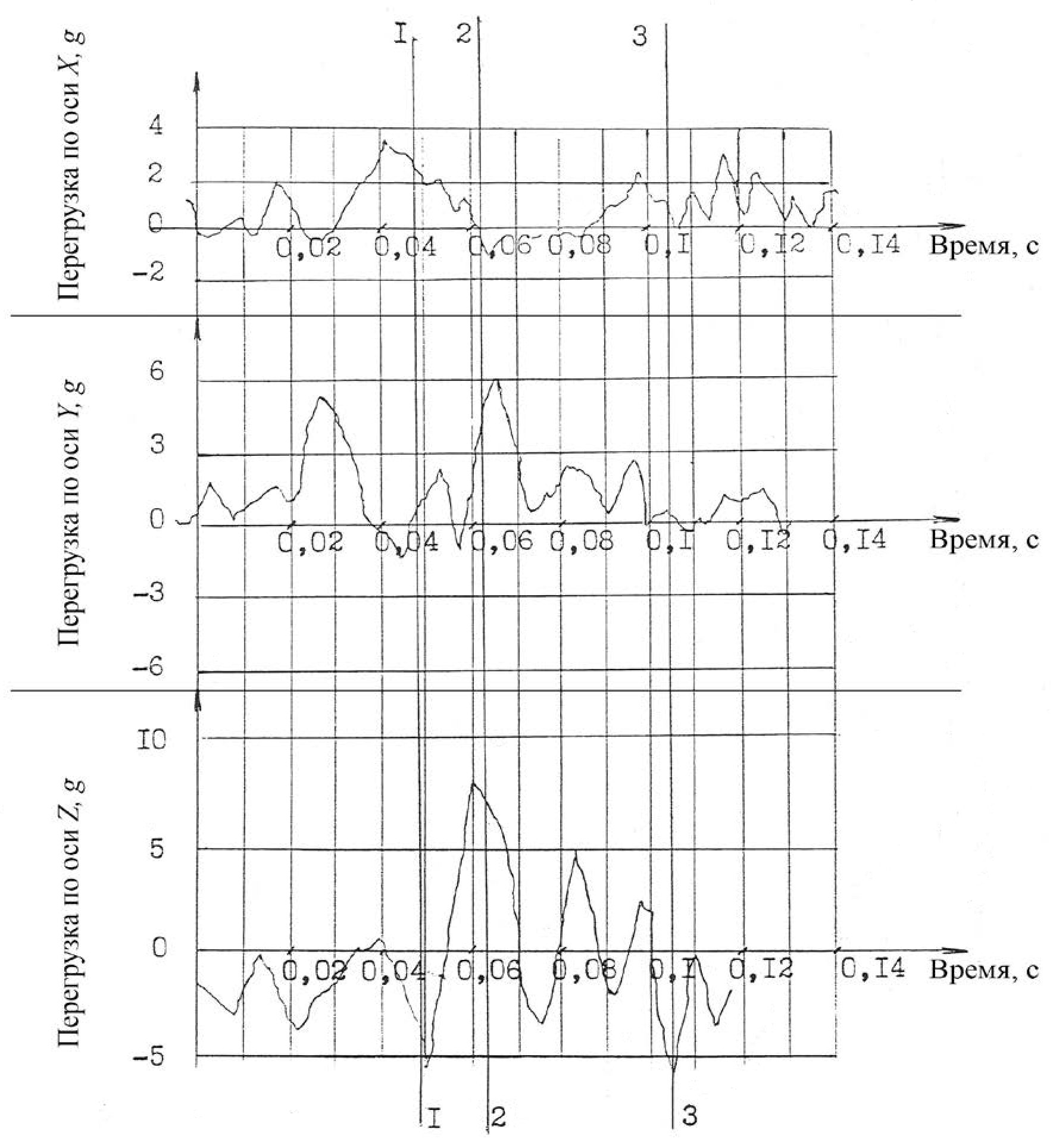- результирующее ускорение головы при длительности воздействия 3 мс не должно превышать 80g;