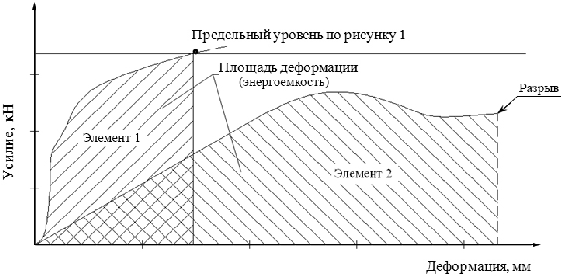 5.3.2. Результатом стендового статического испытания является значение поглощаемой энергии (энергоемкость), определяемое по площади диаграммы деформации (рисунок 2) испытуемого фрагмента (элемента) барьерного ограждения, или значение предельного усилия, кН, достигнутое при испытании блока парапетного ограждения.