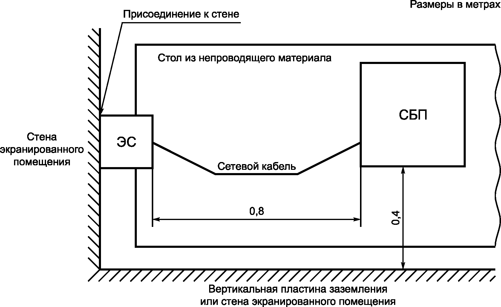 Испытания на устойчивость к электромагнитным помехам целесообразно проводить в испытательной лаборатории. В помещении лаборатории должна быть металлическая пластина заземления, выступающая не менее чем на 0,5 м за контуры испытуемой СБП со всех сторон. Размеры пластины заземления должны быть не менее 1 x 1 м.