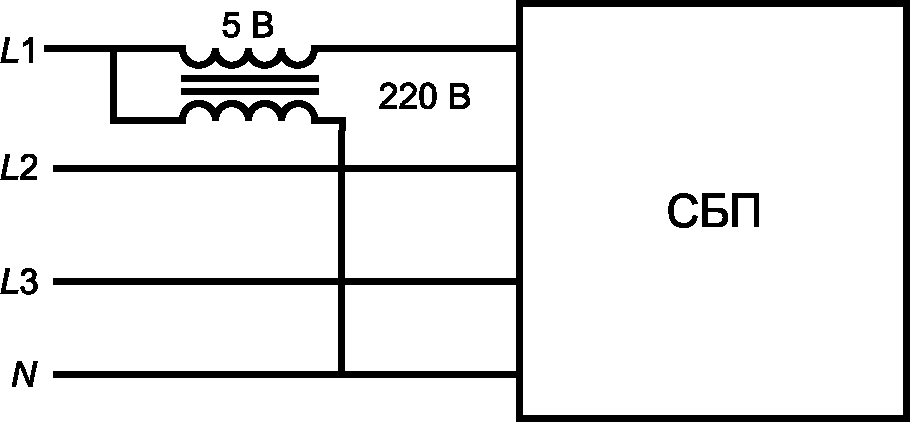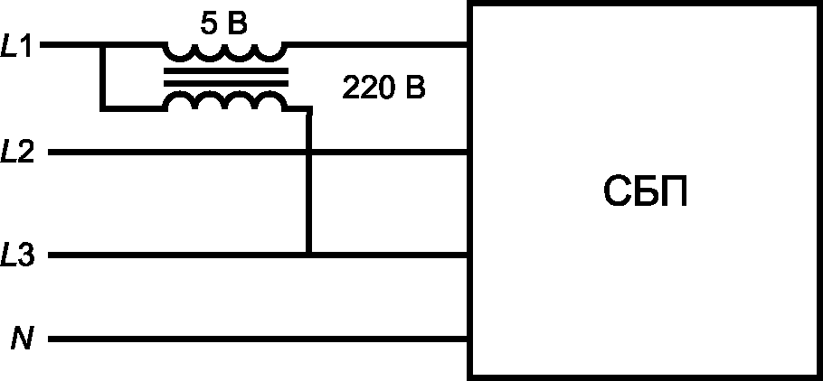 Испытания на устойчивость к фазовой несимметрии напряжений проводят с использованием трансформатора с отношением витков 380:5, подключаемого к входу СБП при напряжении 380 В, как представлено на рисунке D.2. Испытания проводят в соответствии с рисунком D.2, а также при обратном подключении первичной обмотки трансформатора.
