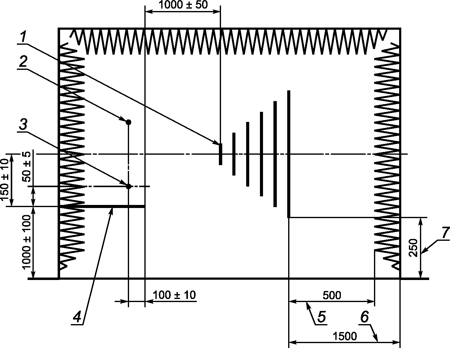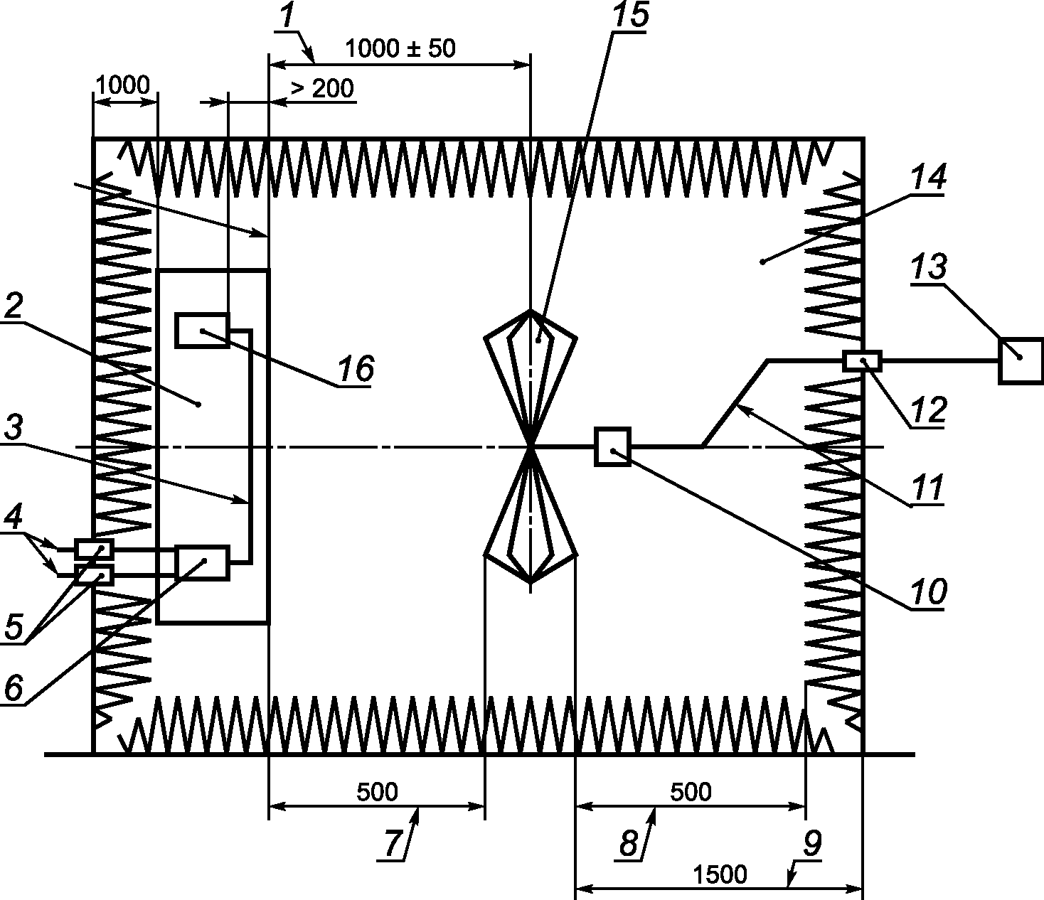 Минимальное расстояние от испытуемого электрического/электронного сборочного узла до других проводящих конструкций, например стен экранированного помещения (за исключением пластины заземления под испытуемым объектом), должно быть не менее 1 м.