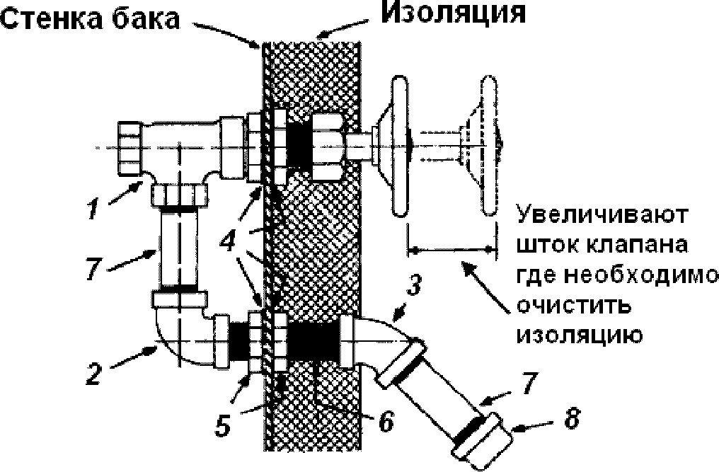 1 - стальной угловой клапан внутренним диаметром 20 мм (3/4 дюйма) "Vogt" P-9844 или аналогичный; 2 - угловой фитинг радиусом 1,6 дюйма, внутренним диаметром 20 мм (3/4 дюйма) из стали или ковкого чугуна; 3 - угловой фитинг радиусом 0,8 дюйма, внутренним диаметром 20 мм (3/4 дюйма) из стали или ковкого чугуна; 4 - 4 асбестовые прокладки, плотно посаженные на резьбу или намотанные с пряжей; 5 - 2 завернутые контргайки N 150 внутренним диаметром 20 мм (3/4 дюйма); 6 - стальной трубный патрубок с параллельными резьбами размером 20 x 90 мм (3/4 x 3 1/2 дюйма), вырезанный из стандартного патрубка для баков; 7 - 2 стальных трубных патрубка с резьбой размером 20 x 75 мм (3/4 x 3 дюйма); 8 - колпачок трубы из стали или ковкого чугуна внутренним диаметром 20 мм (3/4 дюйма); 9 - стенка бака; 10 - изоляция