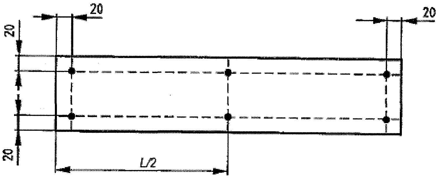 Толщину определяют с помощью толщиномера на расстоянии 20 мм от кромок на углах образца и в середине продольных сторон (рисунок А.3).