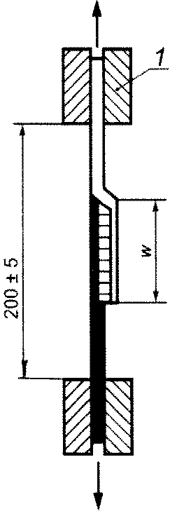 Испытание проводят на пяти образцах шириной (50 +/- 1) мм, вырезанных из подготовленных пластин перпендикулярно линии склеивания. Длина образцов должна быть такой, чтобы исходное расстояние между зажимами было (200 +/- 5) мм (см. рисунок 1).