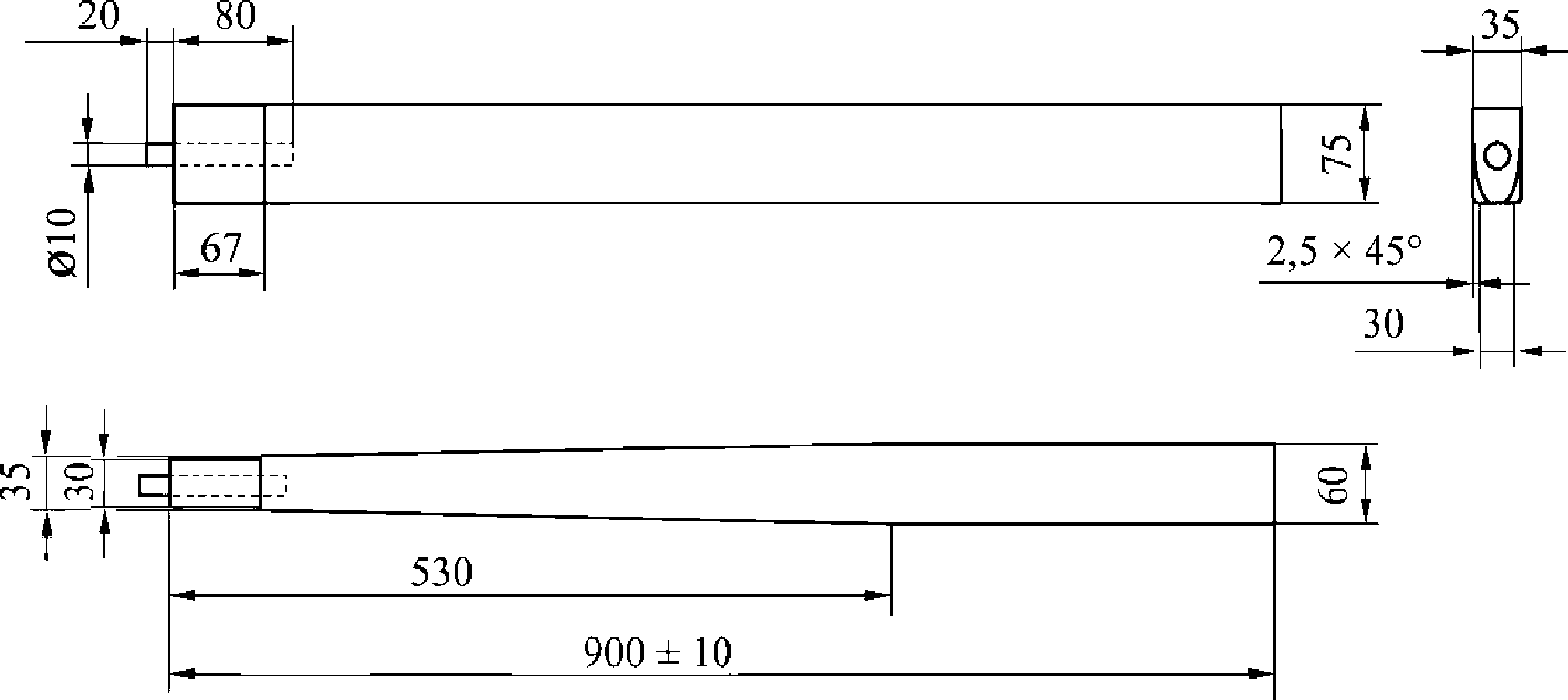 - со стороны рукоятки в направлении удара рукоятка должна быть обжата стальной пластиной шириной (60 +/- 2) мм, длиной (300 +/- 5) мм, толщиной (6,0 +/- 0,1) мм, давление обжима (100 +/- 20) кН/м2;