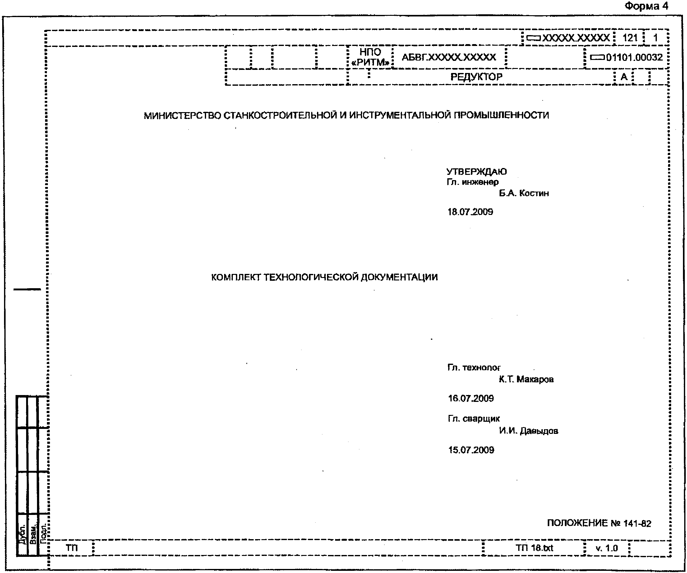 Настоящий стандарт устанавливает формы и правила оформления технологических документов общего назначения: титульного листа, технологической инструкции и карты эскизов, разрабатываемых с применением различных методов проектирования.