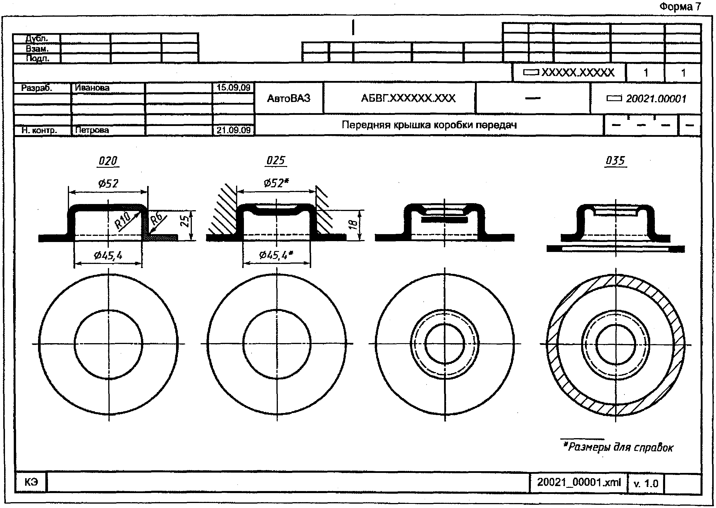 7.5 Для сокращения процедуры оформления допускается применять взамен первого или заглавного листа КЭ последующие листы, если КЭ и основной технологический документ разрабатывает один исполнитель. В этом случае на КЭ в графе 4 основной надписи следует проставлять обозначение того документа, к которому КЭ относится, с применением сквозной нумерации листов в пределах данного документа. Например, при описании операции обработки резанием на двух листах ОК эскиз выполнен на
