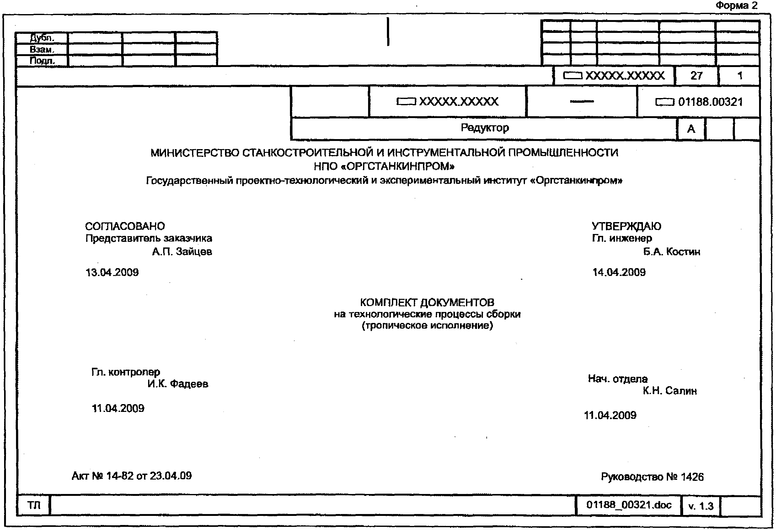 - делать на поле 6 отметку о соответствии комплекта (комплектов) документов (документации) на технологические процессы отдельным "Положениям" или "Руководствам", действующих в организации (на предприятии).