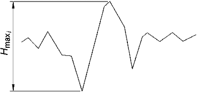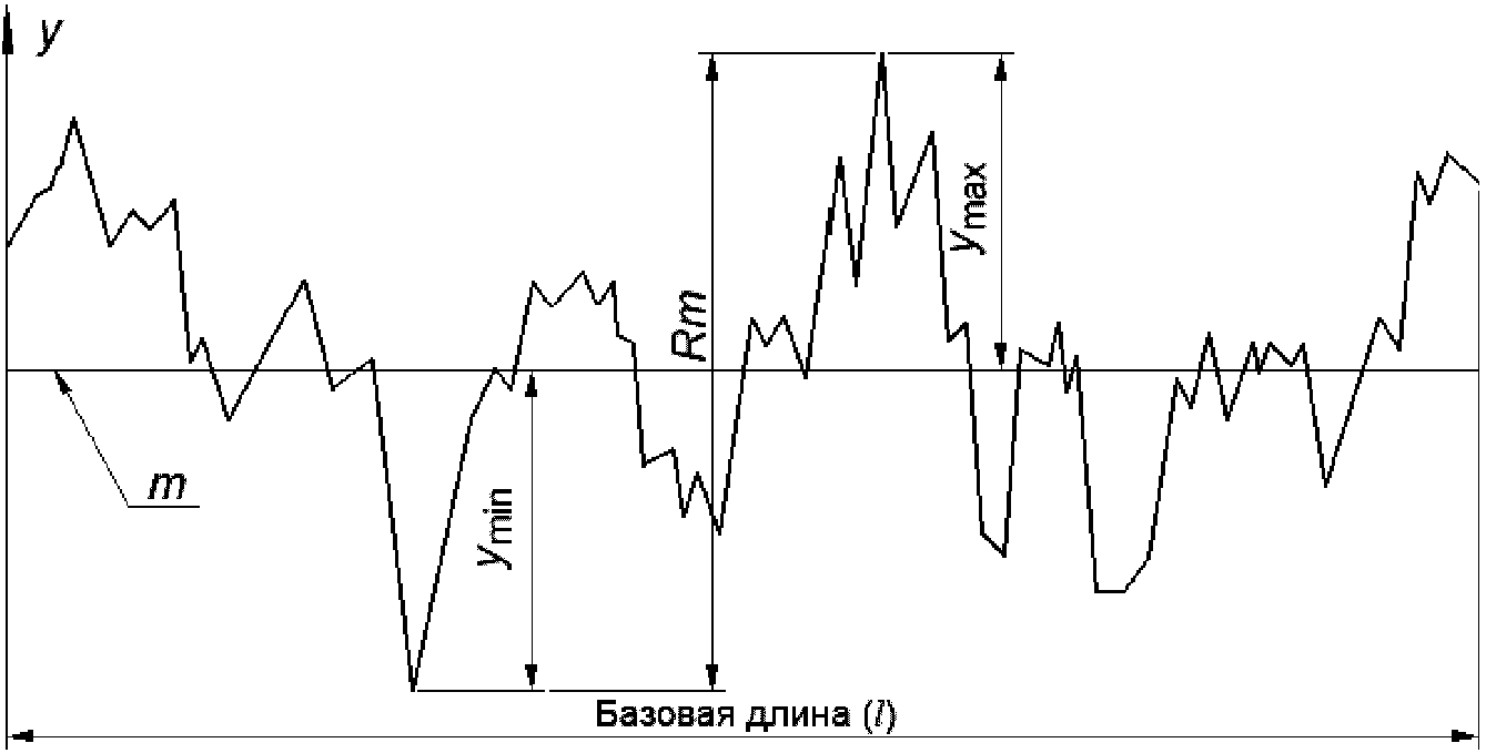 5.1.2. Высота неровностей профиля Rm - расстояние между высшей точкой наибольшего выступа профиля и низшей точкой наибольшей впадины профиля в пределах базовой длины (рисунок 2) - определяется по формуле