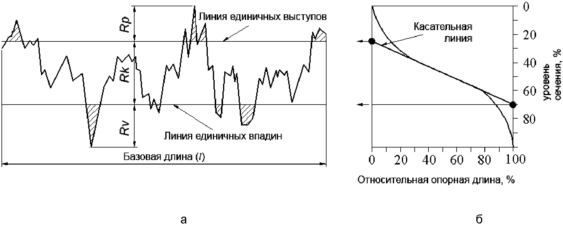 3.23. линия единичных впадин: Линия уровня сечения профиля, полученная из точки пересечения касательной к центральному прямолинейному участку относительной опорной кривой с перпендикуляром, восстановленным в точке 100 процентов по оси относительной опорной длины.