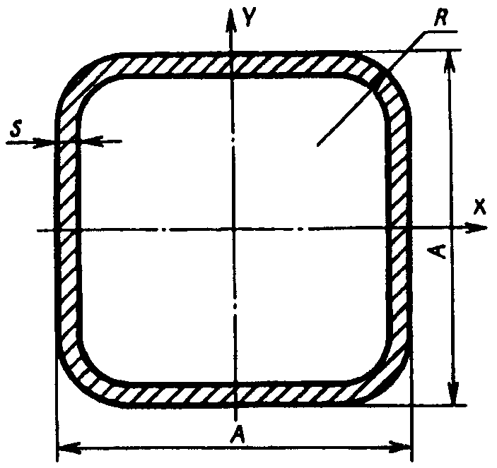 Наружный размер А, мм | Толщина стенки s, мм | Площадь сечения, см2 | Масса 1 м, кг | Момент инерции, см4 ~= | Момент сопротивления, см3 ~= |