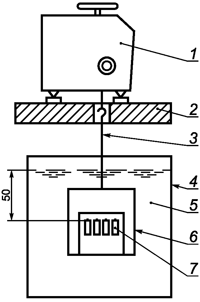 1 - емкость с водой; 2 - пригруз, удерживающий образец