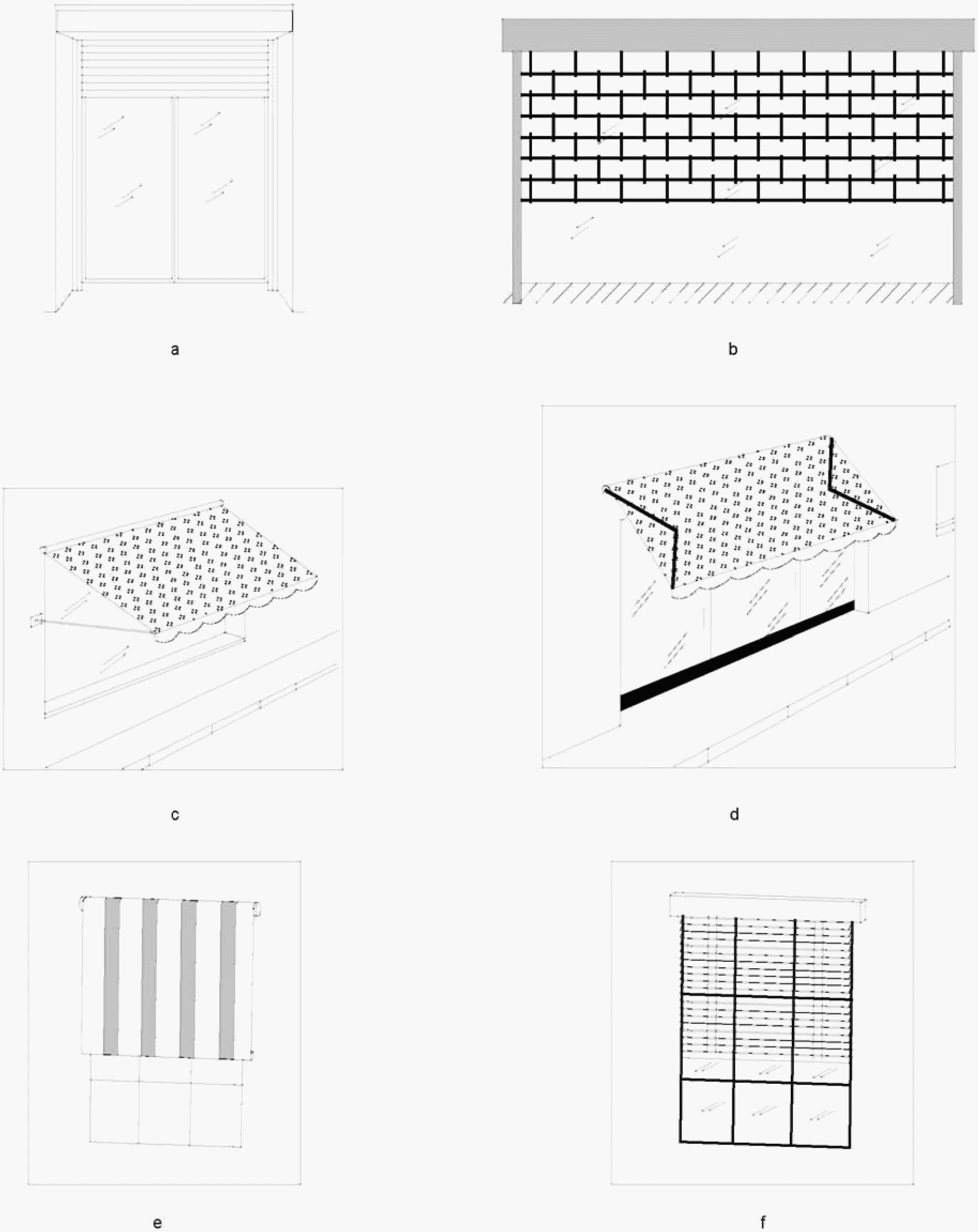 Типы: a - ставни; b - решетка; c - тент; d - складной тент; e - жалюзи; f - подъемные жалюзи