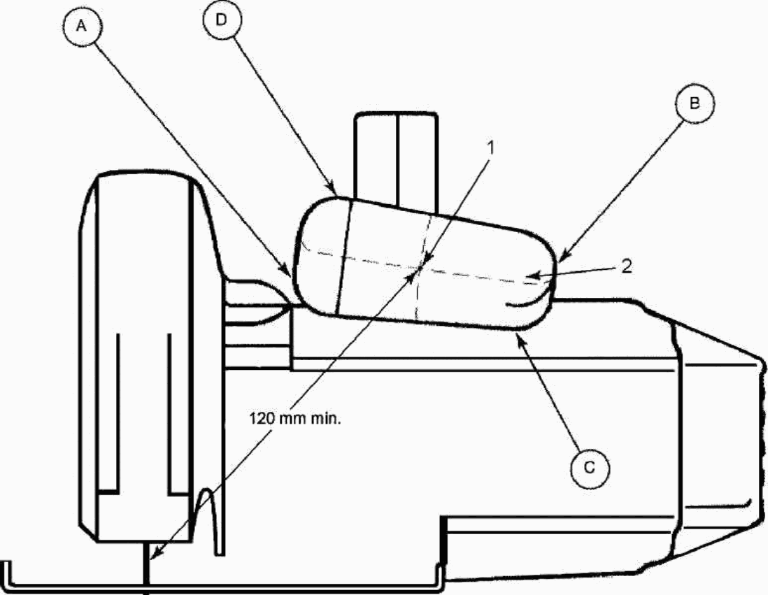 Пилу настраивают на угол 90°. Пилы, имеющие защитные кожухи или систему защитных кожухов, показанные на рисунках 101, 102 и 103, настраивают на максимальную глубину пропила. Пилы с системой защитных кожухов, показанной на рисунке 104, испытывают в положении полного закрытия диска. Разместив пилу нижней точкой на высоте 1 м над бетонным полом, сбрасывают ее дважды на пол, как указано далее: