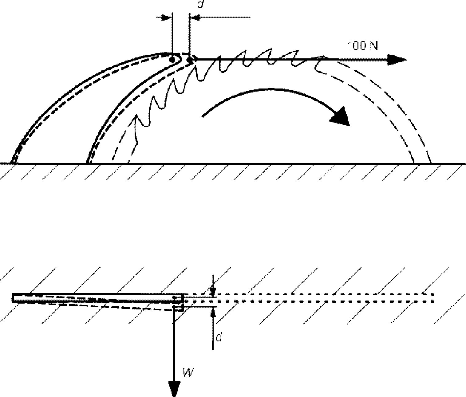 В течение 1 мин прикладывают усилие W величиной, равной весу машины, в центре кончика расклинивающего ножа перпендикулярно диску, как показано на рисунке AA.101.