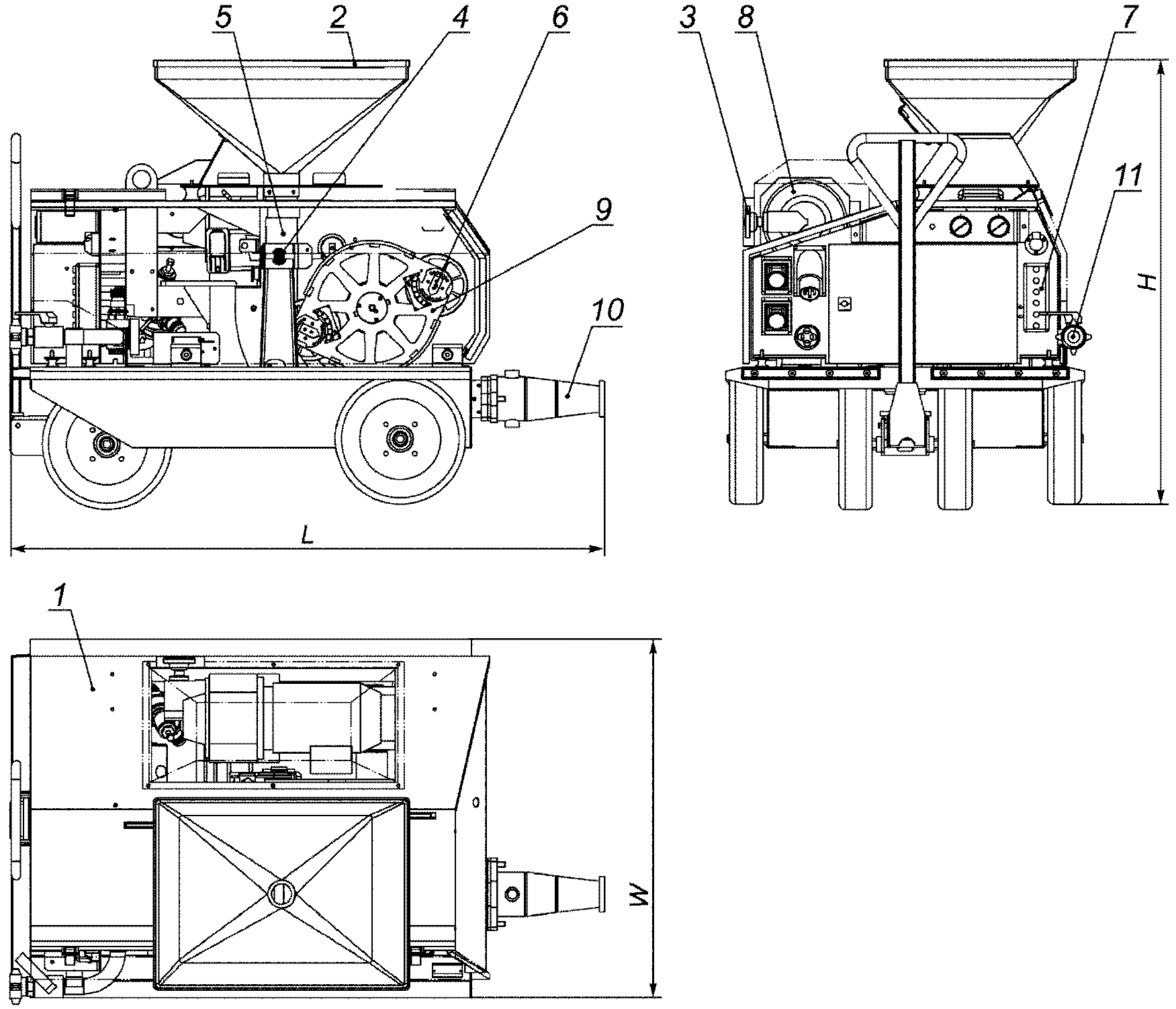 2.10. Шасси (sprayer carrier): шасси, на котором смонтирована установка для торкретирования, обеспечивающее ее передвижение.