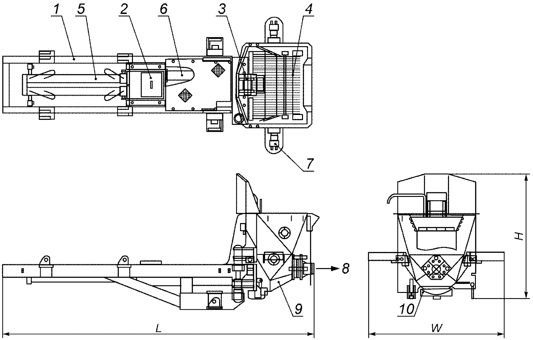 L - длина <а>; W - ширина <а>; H - высота <а>; 1 - шасси;