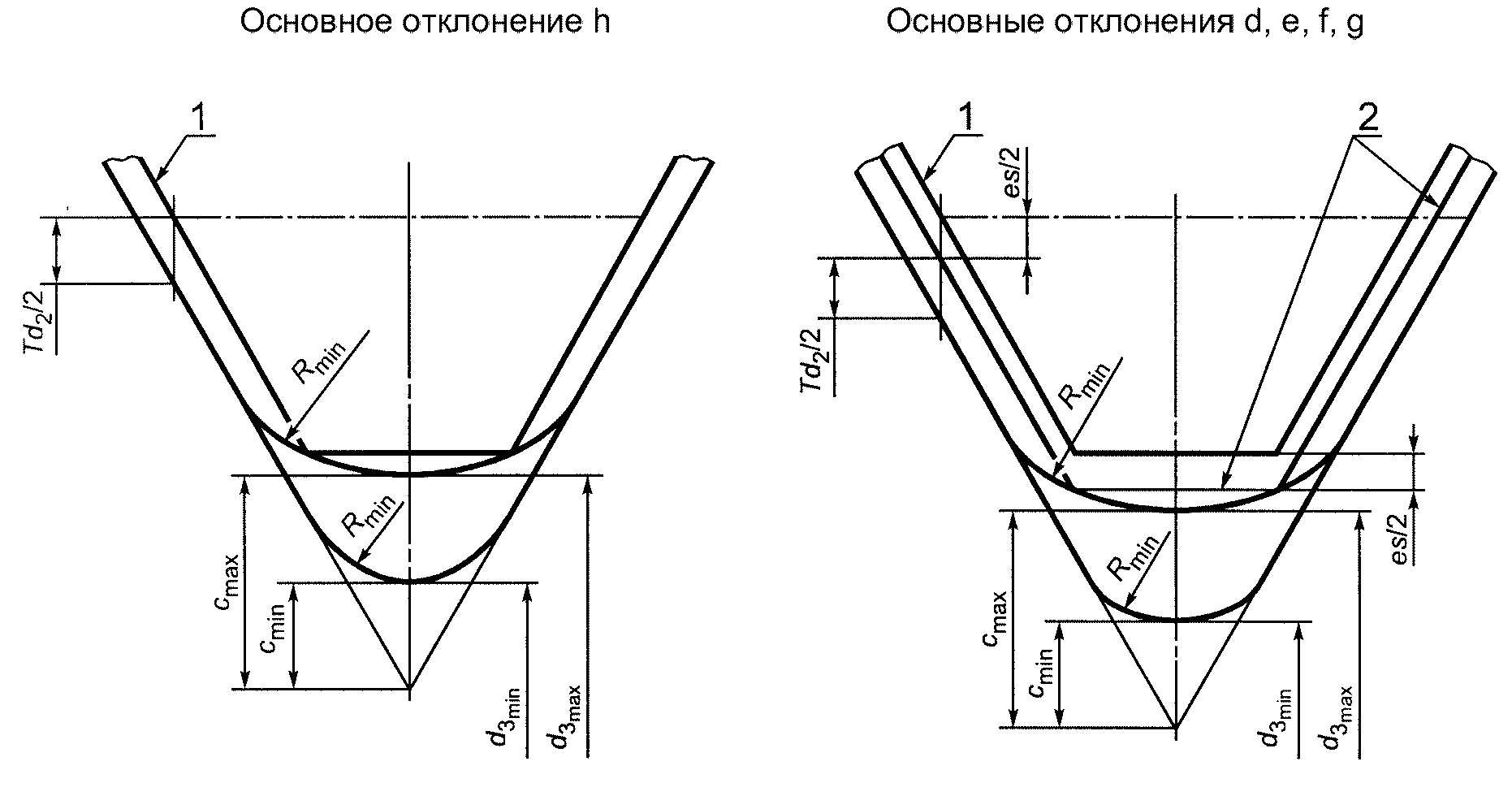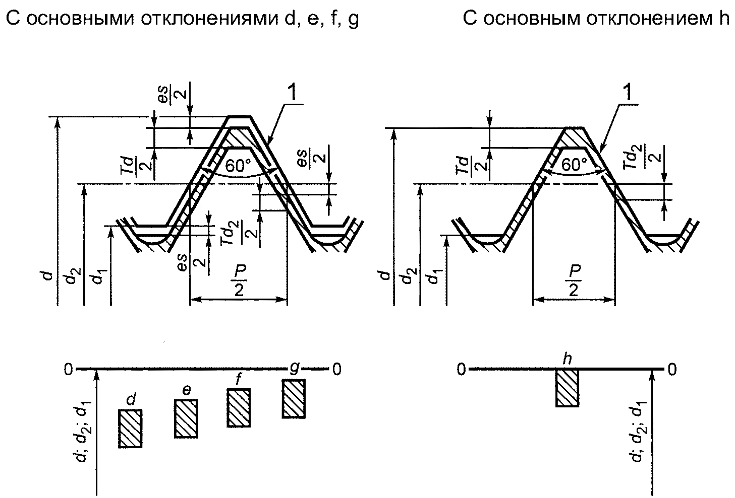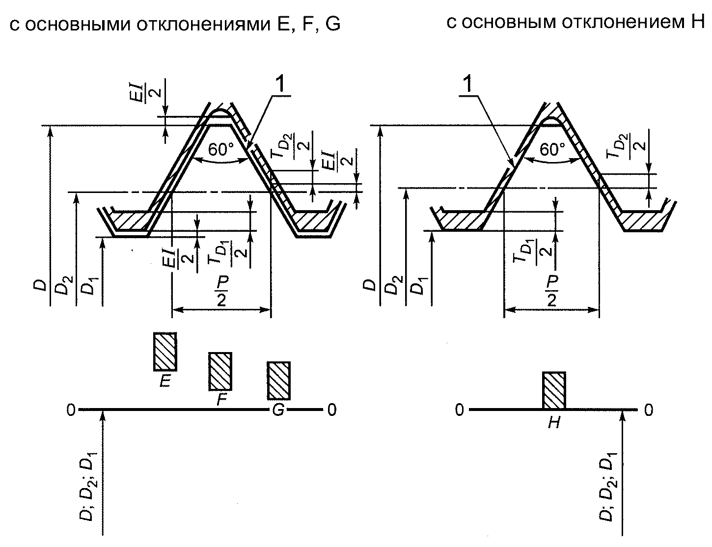Примечания 1. Верхнее отклонение диаметра d1 должно соответствовать основному отклонению диаметра d2. 2. Нижнее отклонение диаметра D должно соответствовать основному отклонению диаметра D2. 3. Основные отклонения внутренней резьбы E и F установлены только для специального применения при значительных толщинах слоя защитного покрытия. | ||