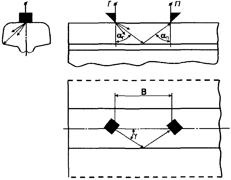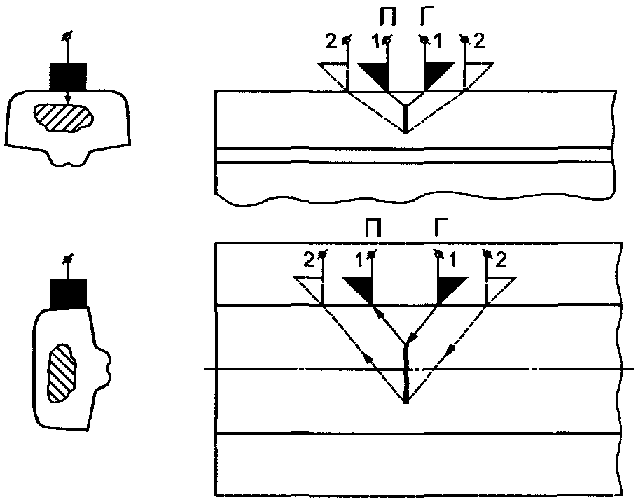 Контроль проводят дефектоскопом с преобразователем частотой 2,5 МГц с углом призмы